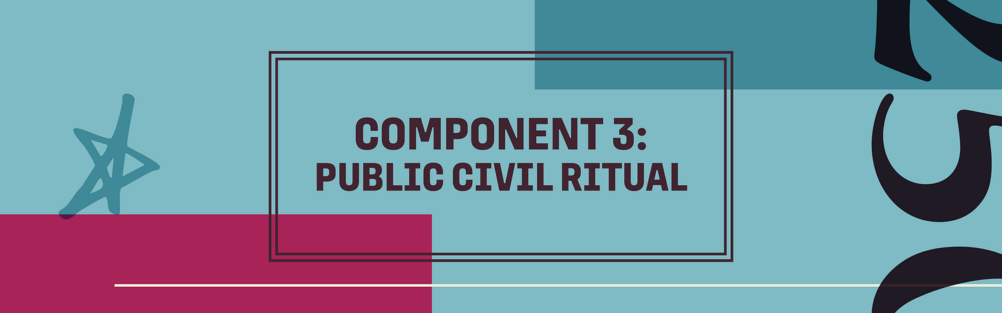 A group of clergy and engaged laity should take point on planning and hosting this ritual around July 4th, 2026. We will offer best practices, guidance, and resources from other clusters and participating clergy, and you will adapt, add, subtract, and fully design your ritual. Each cluster will create something unique - your public civic ritual should speak to local civic needs and communicate the vision of your cluster. The planning will likely run concurrent with fellowship activities.