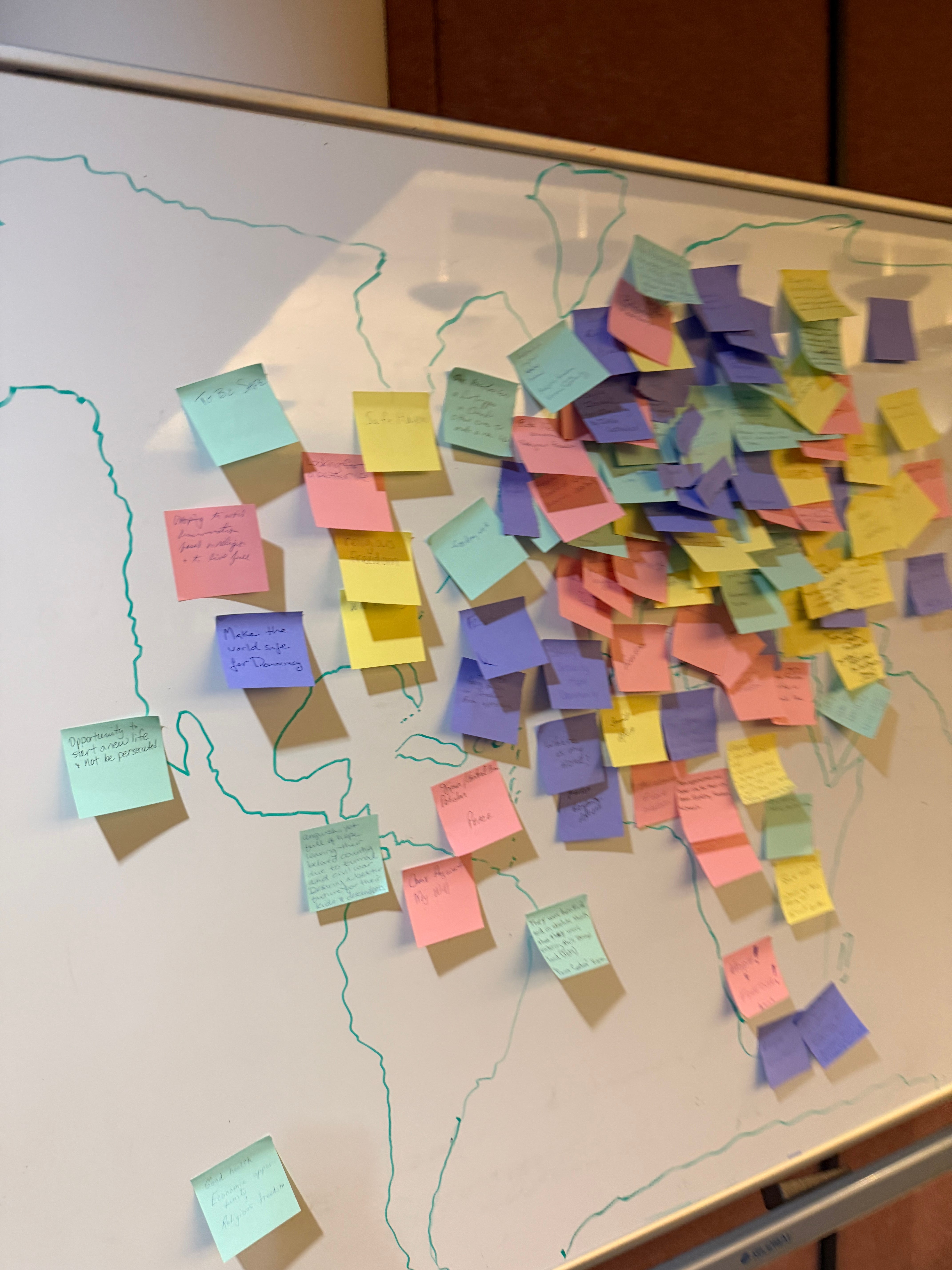 At 6:05 and 6:10 we asked people to write on a Post-It: “What were you or your ancestors thinking or hoping when they came to this country?” And then we had a huge map on the wall for people to place their Post-It on the place from which their family had come (see photo below).