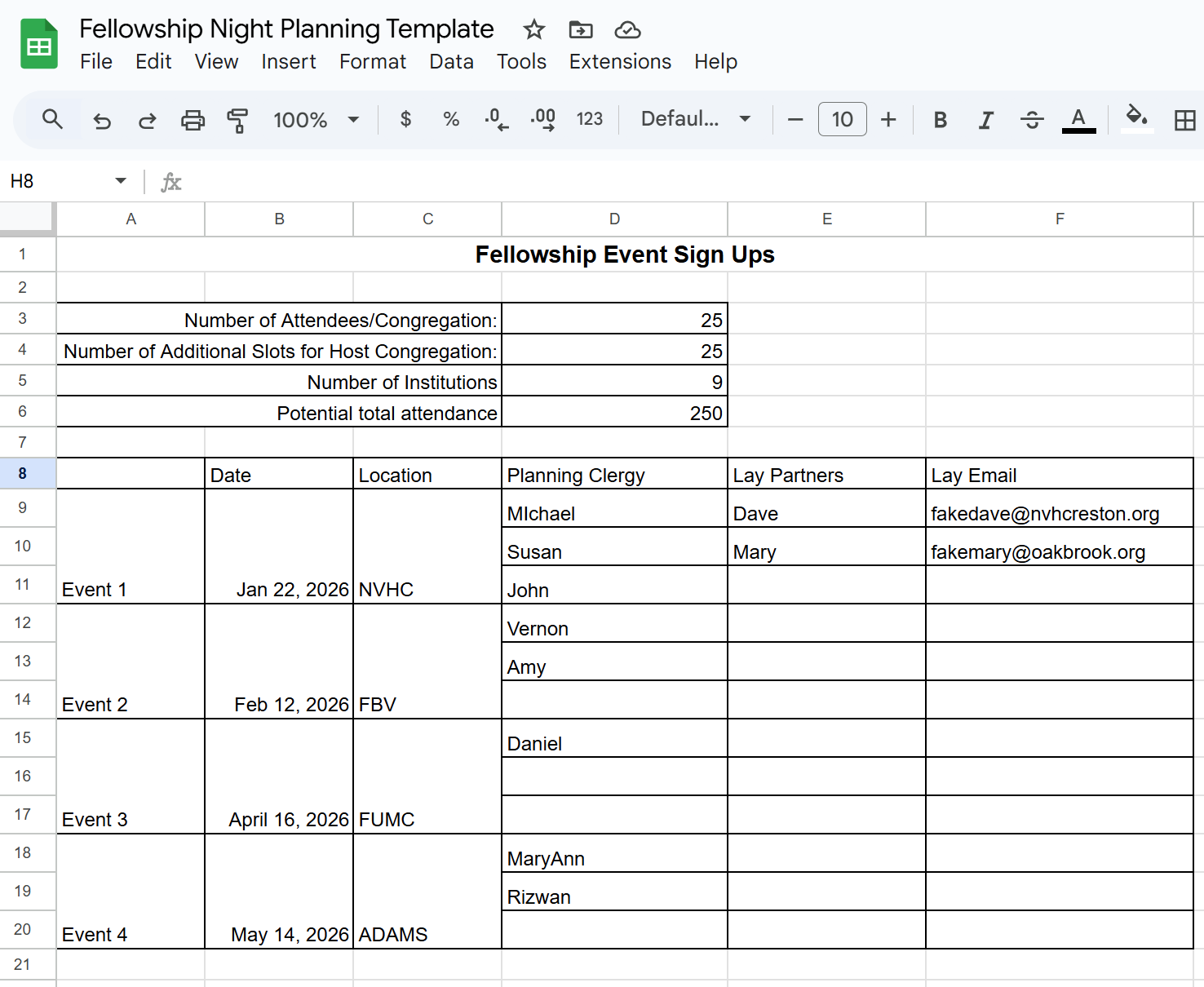 Given that our cluster has nine institutions, we decided to limit attendance to 25 people/congregation, with the host congregation allowed an extra 25 to guarantee enough host volunteers. The congregations with a space big enough for 250 people each signed up for one of the four dates, and a clergy person from a non-hosting congregation signed up as a planning partner.