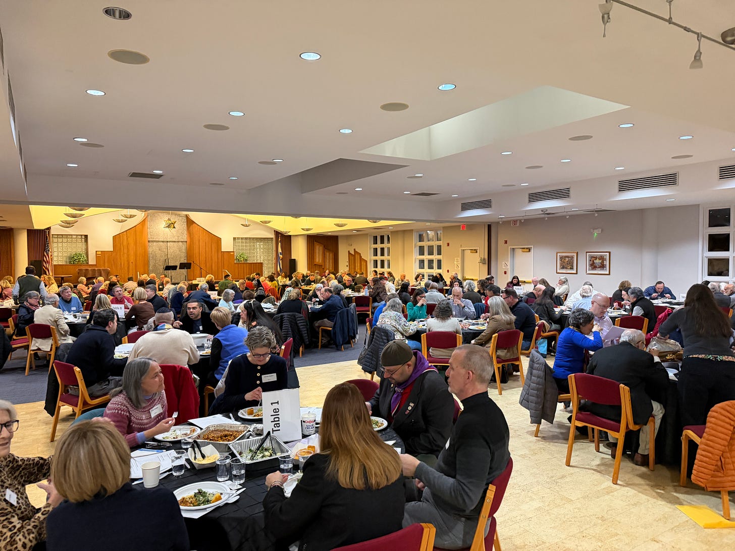 In the Reston/Herndon cluster, we called our gathering “Fellowship Night” and it was a massive success. We had capacity for 250 people and 170 showed up for a huge potluck at 24 tables with spirited conversation across nine congregations.